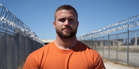 Serious Man In Orange Uniform Near Chain Link Fence, Conveying A Sense Of Confinement And Isolation
