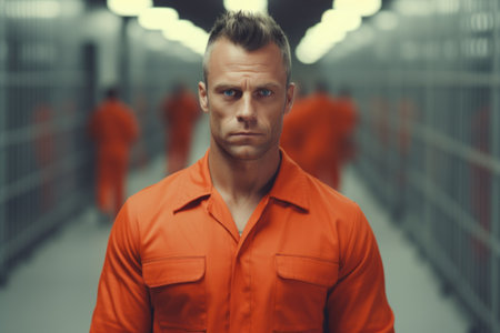 A man wearing an orange prison uniform stands in a hallway. This image can be used to depict concepts of incarceration, justice, or criminal justice system.