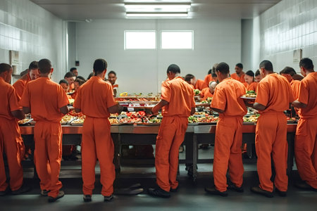Prisoners in orange jumpsuits are lining up at a buffet, collecting meals in a bustling prison cafeteria, highlighting daily routines and communal dining within the correctional facility