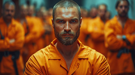 A group of four individuals in orange prison jumpsuits displays their strength and solidarity in a narrow, dimly illuminated corridor, exuding an air of resilience and defiance.