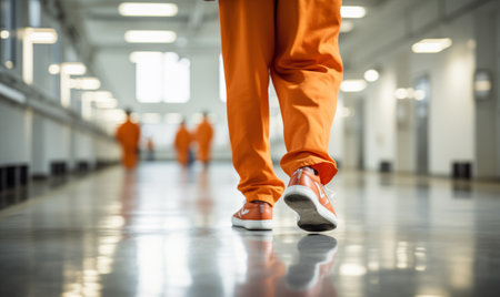 A row of incarcerated individuals in matching orange attire, focusing on their lower body. The scene depicts a disciplined and orderly formation on a paved surface