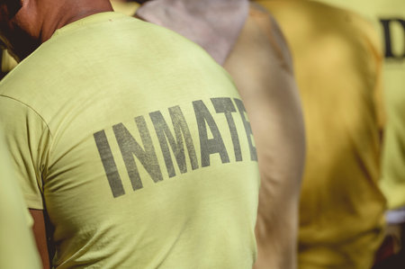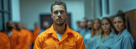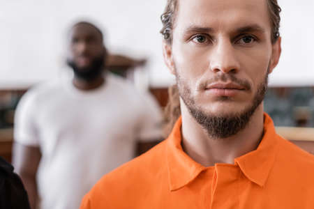 bearded man in jail uniform looking at camera near blurred african american juryman