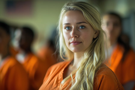 A close-up portrait of a young, pretty female intimate with blonde hair, wearing an orange jumpsuit and looking at the camera, with other inmates blurred behind her.