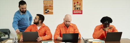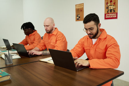 Three young adult inmates sitting at table using laptops and listening during educational program in classroom with posters on wall