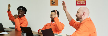 Three young adult prisoners sitting at table raising hands during group discussion, using laptops, participating in educational or training session