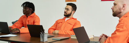 Three young adult men sitting at table using laptops and writing in notebooks, wearing orange uniforms, participating in educational program