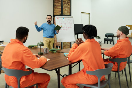 Caucasian middle aged man teaching poetry class to group of young adult men in orange prison uniforms, diverse group listening attentively at desks in correctional facility classroom