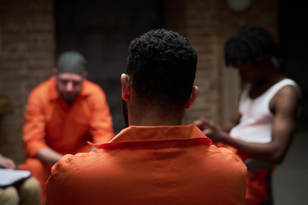 Group of multiethnic young men sitting in circle participating in group therapy session in prison setting, wearing orange uniforms, engaging in discussion
