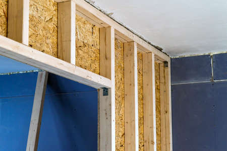 Close up detail of house construction wooden wall elements. Interior frame renovation work
