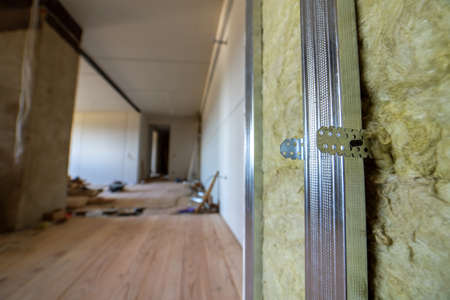 Wall of a room under renovation with mineral rock wool insulation and metal frame prepared for drywall plates.