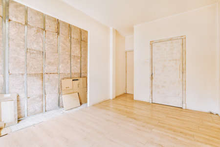 Empty under construction room in home or house with space on site. Interior. Old unfurnished room rental property, living space units. lifestyle. Renovation.