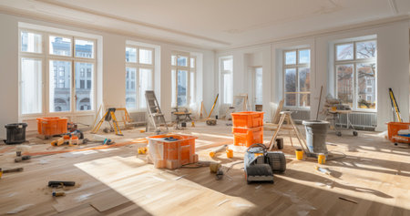 Large empty room flooded with sunlight during renovation with building materials and large windows