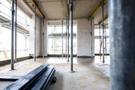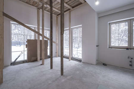 Interior of empty room in a new house under construction with scaffolding