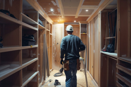 A man makes a wardrobe in a dressing room. The master repairs the cabinet.