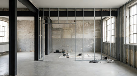 This image showcases an empty industrial room in renovation, featuring exposed walls, framing elements, and natural light streaming through large windows.