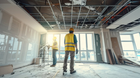 Construction workers renovating apartment hallway with tools and natural light for home improvement