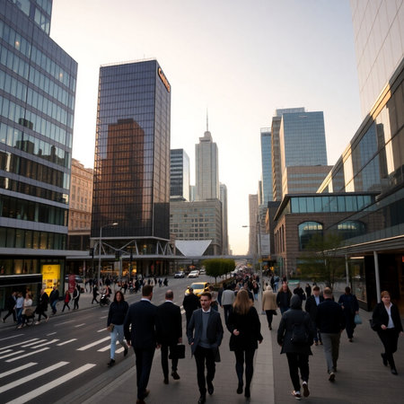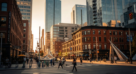 A captivating cityscape featuring a blend of modern and historic architecture. The image showcases a vibrant street scene with a mix of glass skyscrapers and classic buildings illuminated by sunset light.