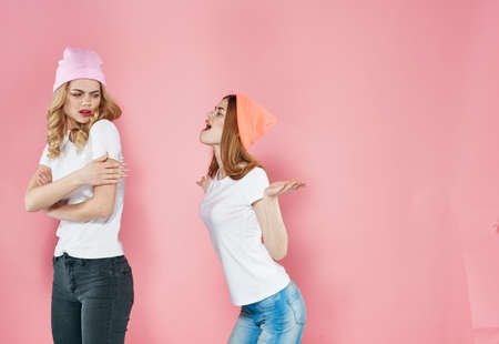 two sisters trendy modern clothes friendship glamor pink background