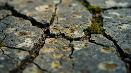 Explore the intricate beauty of weathered stone with this close-up macro image. The detailed shot reveals a cracked grey stone surface adorned with patches of vibrant green moss and lichen thriving in the deep cracks and fissures. This macro photography showcases the natural texture and pattern created by age and the environment. Ideal for backgrounds, design elements, or illustrating themes of deterioration, this image brings a rough yet organic detail to any project. The aged aesthetic offers a unique visual appeal.
