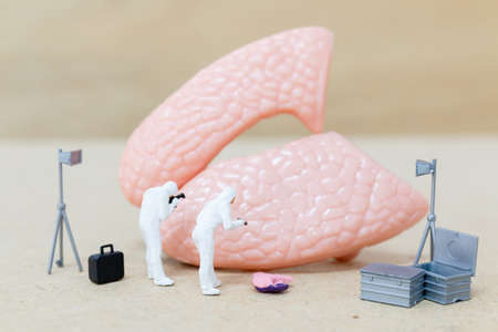Miniature people , Scientist observing and discussing about human lungs