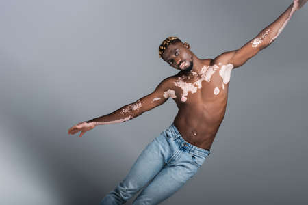 shirtless african american man with vitiligo and trendy hairstyle posing with outstretched hands isolated on grey