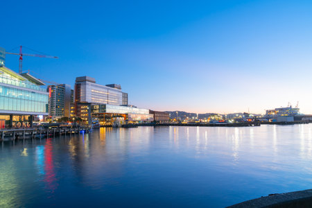 Wellington New Zealand _ July 28 2021;Wellington skyline at night from wharf with city lights, signs and reflections on harbor