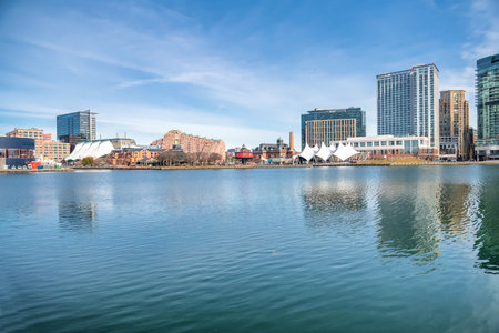 Baltimore modern skyline, high rise buildings, blue sky, waterfront, cityscape, Maryland summer travel.
