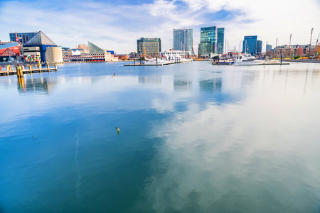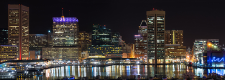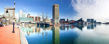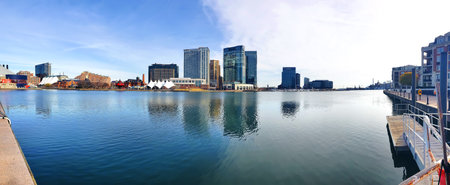 Business buildings center reflected in the water of the bay in Baltimore, Maryland. The waterfront and architecture of the city. Panoramic shot.