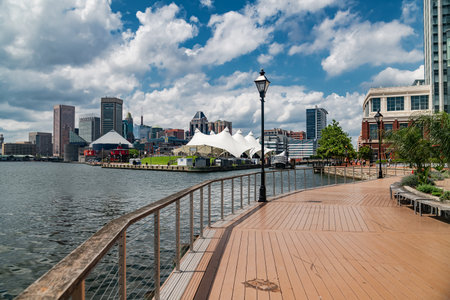 Downtown Baltimore Bayfront on a Clear Day. Contemporary high-rise buildings and walking path by the water.