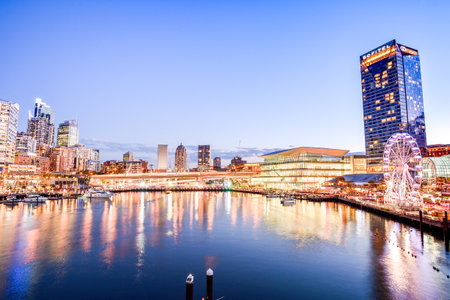 Modern cityscape with business office buildings and picturesque harbour at sunset. Darling Harbour, Sydney, Australia