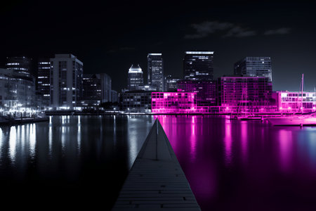 Vibrant city skyline shines under night sky with reflections on calm water surface