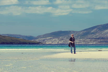 Young Caucassian woman enjoying holiday on a white sandy beach with turquoise water, Luskentyre, Isle of Harris, Scotland