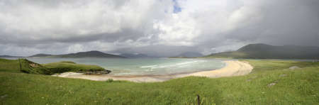 A panorama of Seilebost Beach on a showery day, South Harris, Western Isles, Scotland