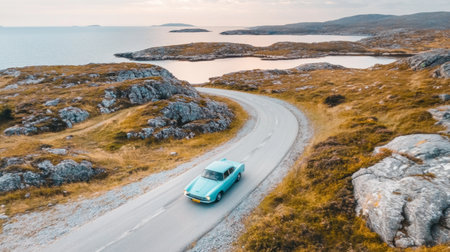 A stunning aerial view of a turquoise car driving along a winding coastal road, surrounded by rocky terrain and serene waters, capturing the essence of adventure and exploration.