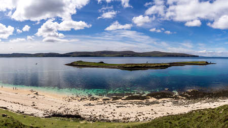 Panoramic image of Kilvickeon Beach, on the Isle of Mull, Scotland, with views of the Isle of Jura in the background and some clouds in the sky