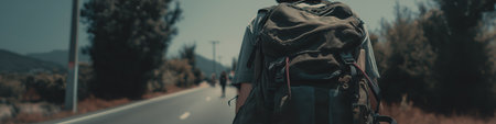 Backpacker walking on a road at sunset, motion blur suggesting movement and travel. Backpacker walking road at sunset journeying towards destination