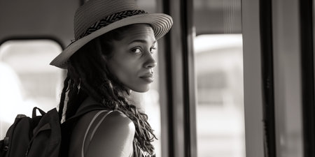 Black and white image of a contemplative young woman with a straw hat looking out of a train window
