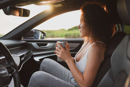 beautiful young woman travel on the roads by car, stopped at the side of the road and look at the map, drink coffee