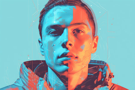 Male caucasian teen with distorted digital effect and fragmented overlay.