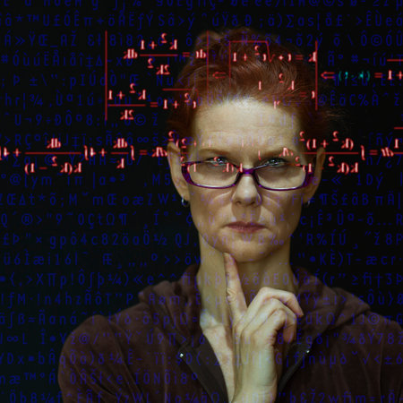 Dark portrait of young man in eyeglasses with computer code on his face