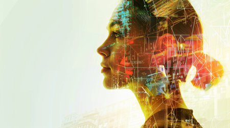A contemporary digital art piece depicting a fragmented portrait with vibrant colors and geometric patterns on a creative backdrop
