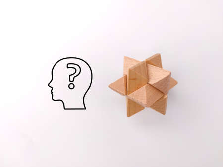 Wooden toy puzzle with question icons on a white background. Innovation concept.
