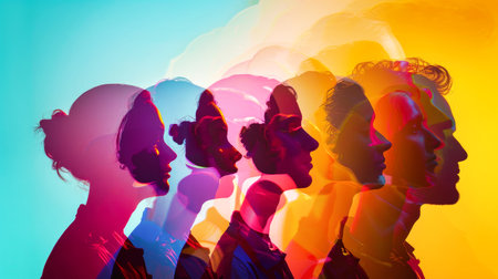 The essence of a person through layered exposures, showing different angles and emotions in a striking visual style.