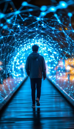 Walking Towards Innovation Man in Futuristic Digital Tunnel, Blue Network Connectivity
