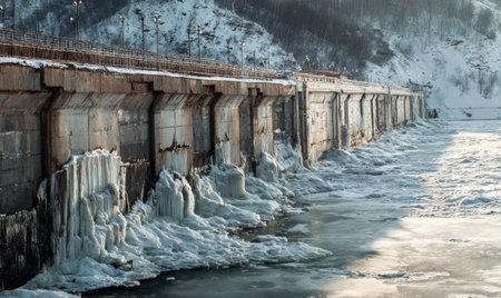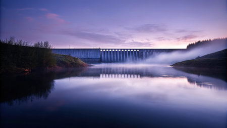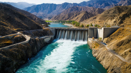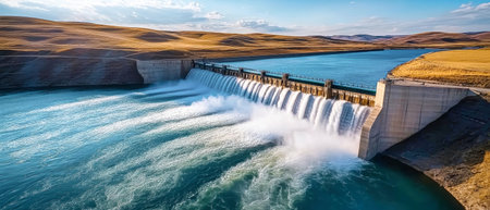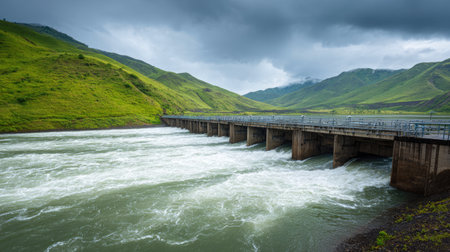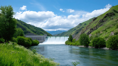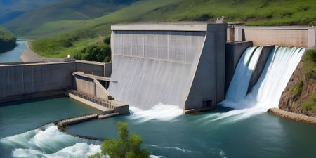 Hydropower dam spanning a river valley, providing clean energy to surrounding communities.
