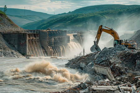 Dams Dismantling, Repair of Dam, Destroyed Dam on a River in Forest, Generative AI Illustration
