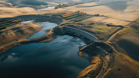Stunning aerial photograph depicting a tranquil reservoir nestled among rolling hills and flourishing fields, capturing the essence of natural beauty.