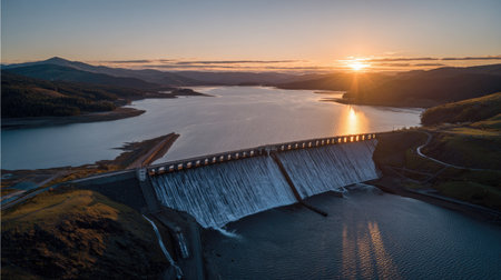 Stunning aerial view of a dam at sunset, releasing powerful white water into a calm reservoir. Surrounded by scenic hills, it captures natural beauty and tranquility.