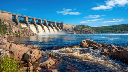 A wide-angle view showcases a massive dam structure, with cascading water flowing into a river. The composition includes a rocky foreground with flowing water, contrasting with the smooth textures of the dam and the clear, bright sky above. This image suits various commercial applications, including editorial content.