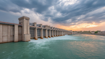 A hydroelectric dam with water flowing through turbines, illustrating renewable energy production